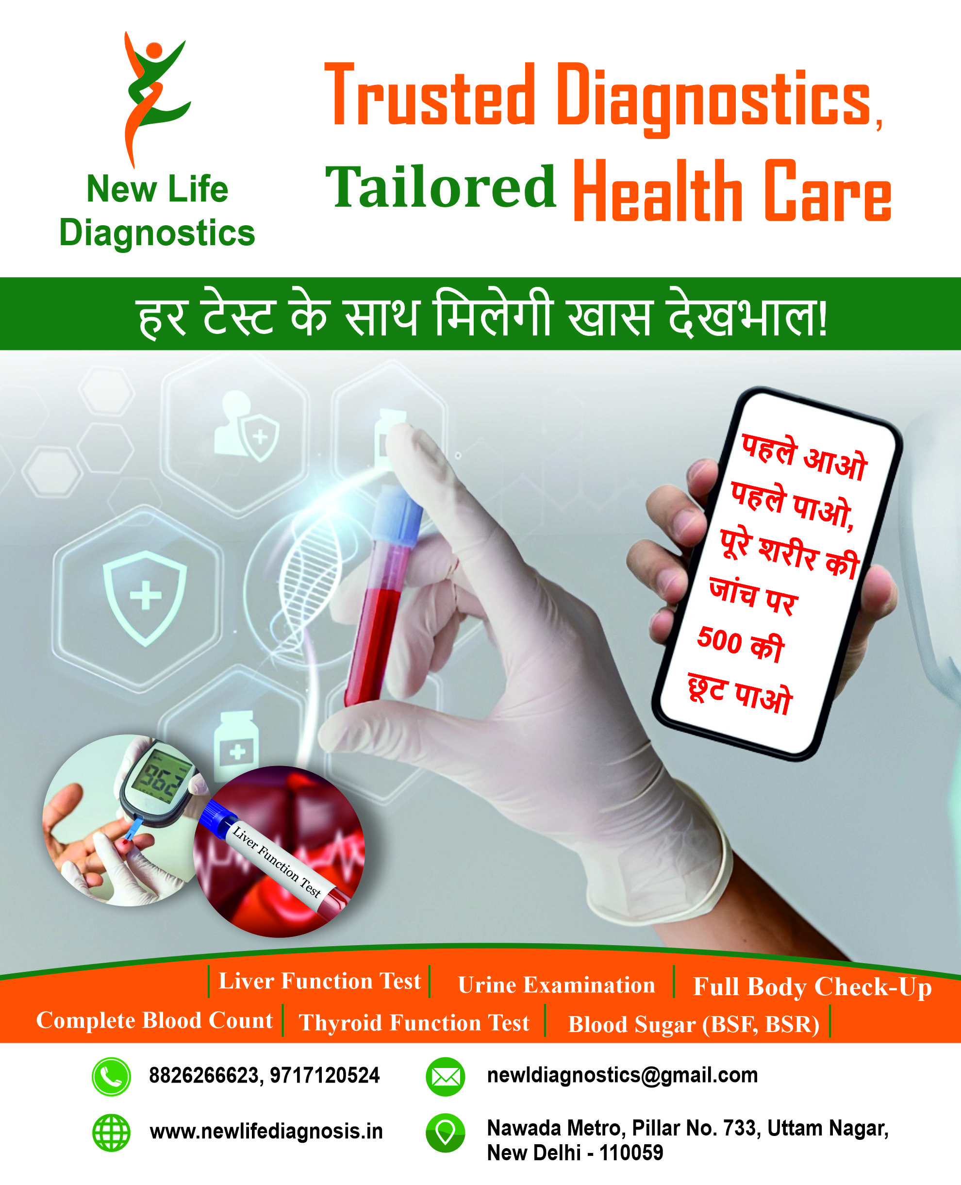 At New Life Health Clinic in Nawada, Delhi, we specialize in diagnosing and managing conditions like Hypertension, Diabetes, Skin Disease, Chest & TB, Thyroid Disorder, Abdominal Problem, Migraine, and Communicable Diseases. Our advanced diagnostic tests, including CBC, KFT, LFT, TSH, Blood Sugar, Cholesterol, and Full Body Packages, ensure accurate results with the convenience of home collection.